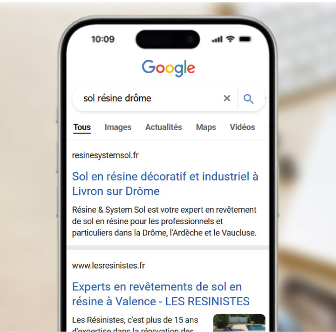 Résine System Sol, basée à Livron-sur-Drôme, est spécialisée dans la pose de sols en résine composite décorative pour les particuliers et les professionnels. L’objectif était clair : gagner en visibilité sur la Drôme en se positionnant sur les recherches locales. Pari tenu, avec une première position sur les mots-clés « sol résine Drôme », « sol résine Montélimar » et « sol résine Valence », consolidant la présence de l’entreprise dans tout le secteur.